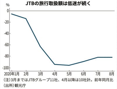 緊急事態宣言中の5月に前年比96%減まで落ちた旅行取扱高は、8月も同82%減にとどまる。海外ツアーは11月末まで中止を決めている。戻り始めた個人旅行客も感染防止策という「足かせ」つきの実店舗の接客では、取り込みも思うに任せない。「Go To」の追い風をいかせないでいる。