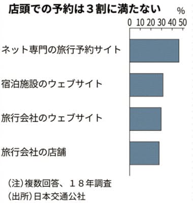 日本交通公社の調査では、2018年時点で国内の宿泊旅行の予約によく使う方法(複数回答)は「ネット専門の旅行予約サイト」が46.4%と最も多く、「旅行会社のウェブサイト」(29.6%)、「旅行会社の店舗」(27.8%)をしのいだ。旅行好きという都内の会社員女性(29)は「国内旅行は飛行機や宿などをそれぞれ手配した方が安いことが多い。代理店のツアーは変更などで融通が効かない」と説明する。