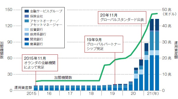 このスタンダードを公表した金融機関のパートナーシップ「Partnership for Carbon Accounting Financials(PCAF)」は、投融資スコープ3排出量の計測・報告スタンダードの策定と普及を目的として、15年にオランダの14の金融機関が発足させた。21年7月18日時点で、142機関(運用資産総額43兆4000億ドル)が加盟している。21年7月にはみずほフィナンシャルグループが加盟し、次いで、ニッセイアセットマネジメントも加盟を発表した。