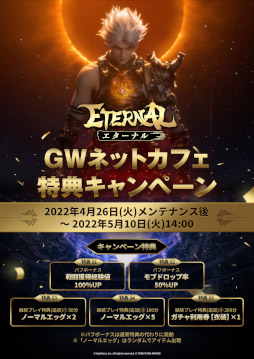 By Sarnem Mani 6:35 AM ネット 「ETERNAL」,“GWネットカフェ特典キャンペーン”を開催中 - 4Gamer.net netto.prelol.com <以下,メーカー発表文の内容をそのまま掲載しています> 超大型“国産”MMORPG『ETERNAL(エターナル)』 ゴールデンウィークはネットカフェがお得! 期間限定の特典キャンペーン開催 〜アバターガチャ券やイベントアイテムが手に入る...