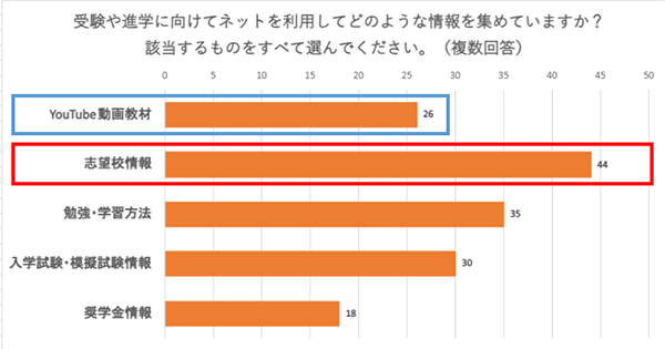 続いて、ネットを使ってどのような情報を集めているのかを聞いたところ、志望校情報が一番多い結果となりました。志望校情報は学校の文化・特色や評判など自身の進路を考える上で非常に重要な情報であり、インターネットを利用することで、最新の情報をいち早く得ることが出来ます。グラフの約8割以上が志望校の情報収集のためにネットを利用していると答えていることから、日常的に多くの生徒がネットから学校情報を調べていると考えられます。