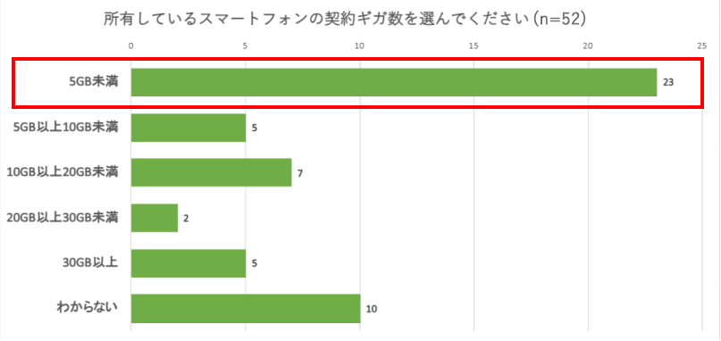 そこで、生徒が所有しているスマートフォンの契約ギガ数を聞いたところ、5GB未満での契約が一番多い結果でした。