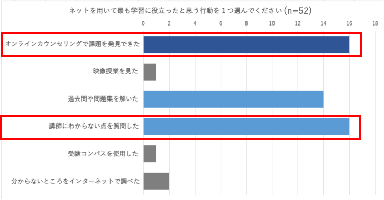 一番多かった回答が同率で“オンラインカウンセリングで課題を発見できた”・ “講師に分からない点を質問した” という結果でした。
