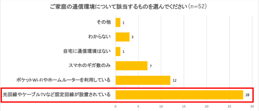 問4より、生徒が所持するスマートフォンの契約ギガ数の40%以上が5GB未満であることが分かりました。そこで、ご家庭の通信環境についてきいたところ約5割のご家庭で、固定回線が設置されているとの結果でした。